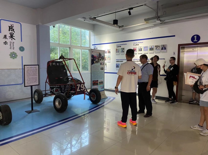 在我校暑期志愿者学生的陪同下,台湾师生参观了设计艺术学院的非遗文化展示中心,并亲身体验了金坛刻纸艺术,深刻感受到了中国传统文化的独特魅力和深厚底蕴。他们纷纷表示,要将这份珍贵的文化遗产带回台湾,与更多家人和朋友分享。随后,台湾师生代表团参观了学校校史馆,对我校的办学历史、实践教学和科研创新成果有了更直观的了解。最后,师生们来到智能制造学院,了解了我校巴哈车队的成立历史,以及参赛车辆的设计制造和测试改进的全过程,这一“寓教于实践”的教学理念令他们对设计炫酷的巴哈赛车也产生了浓厚的兴趣。
