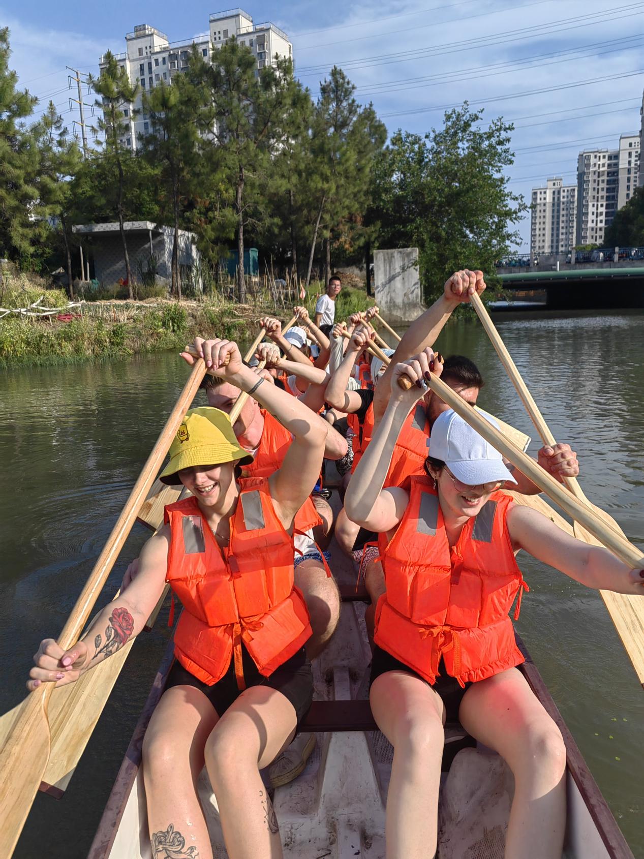 我校励志龙舟队主动邀请匈牙利同学们参与日常训练,双方青年共同参与“迷你龙舟赛”,在协作中体会端午民俗的团结精神,挥桨竞渡,欢声笑语回荡在河面上,增进了彼此间的默契与友谊。