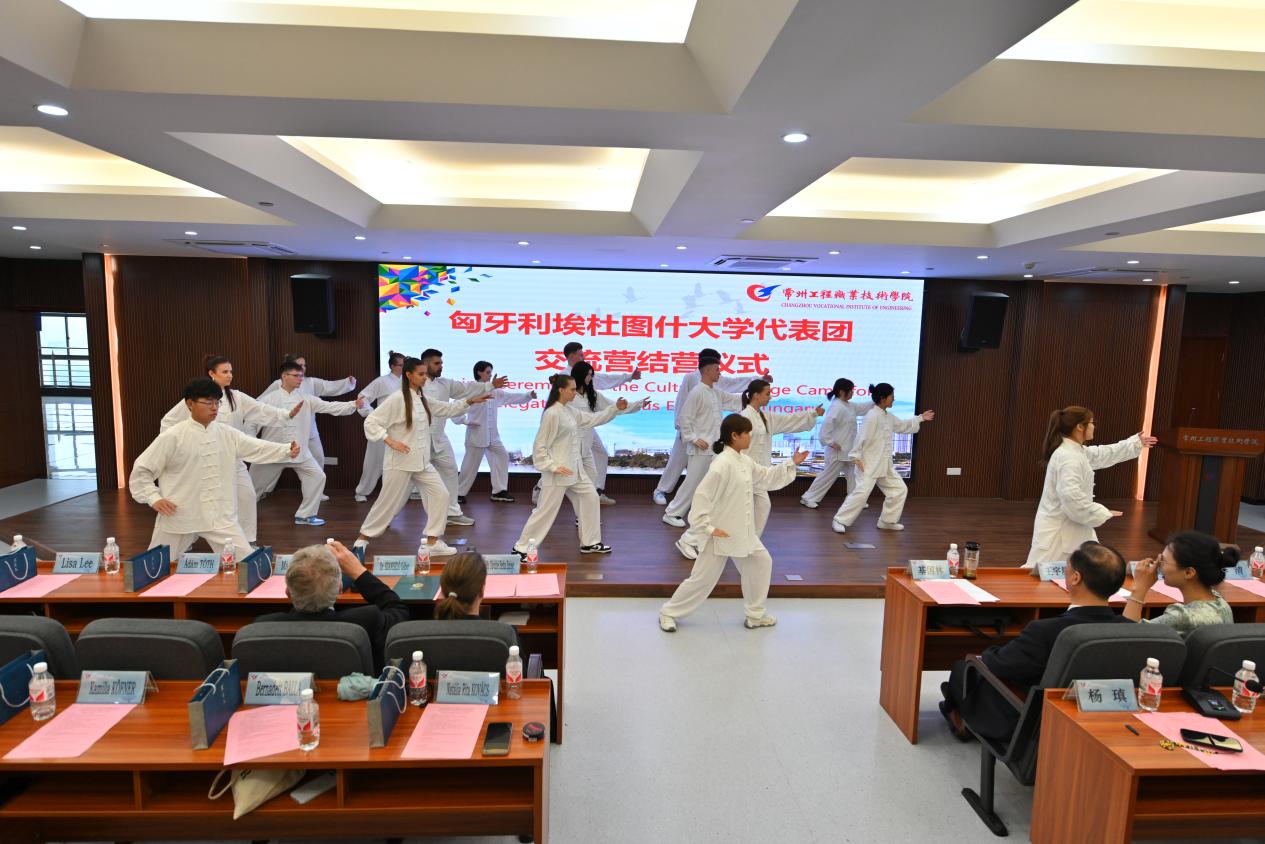 5月21日,匈牙利教育署办公室国家奖学金司司长达维徳内(Dávidné)女士、匈牙利埃杜图什大学布达佩斯校区负责人索尼兹娄(Szaniszló)博士、我校基国林校长、常州市外事办欧非处王宇星副处长等出席了闭营仪式。中匈双方学生合作展演了太极拳研习成果,匈方师生还特意排演了歌曲《茉莉花》。正如达维徳内女士所表示的,真正的教育合作,不是单向的技术转移,而是双向的智慧激荡。12天的朝夕相处,让青年们从“陌生人”变为“一家人”,这正是双向人文交流的意义。